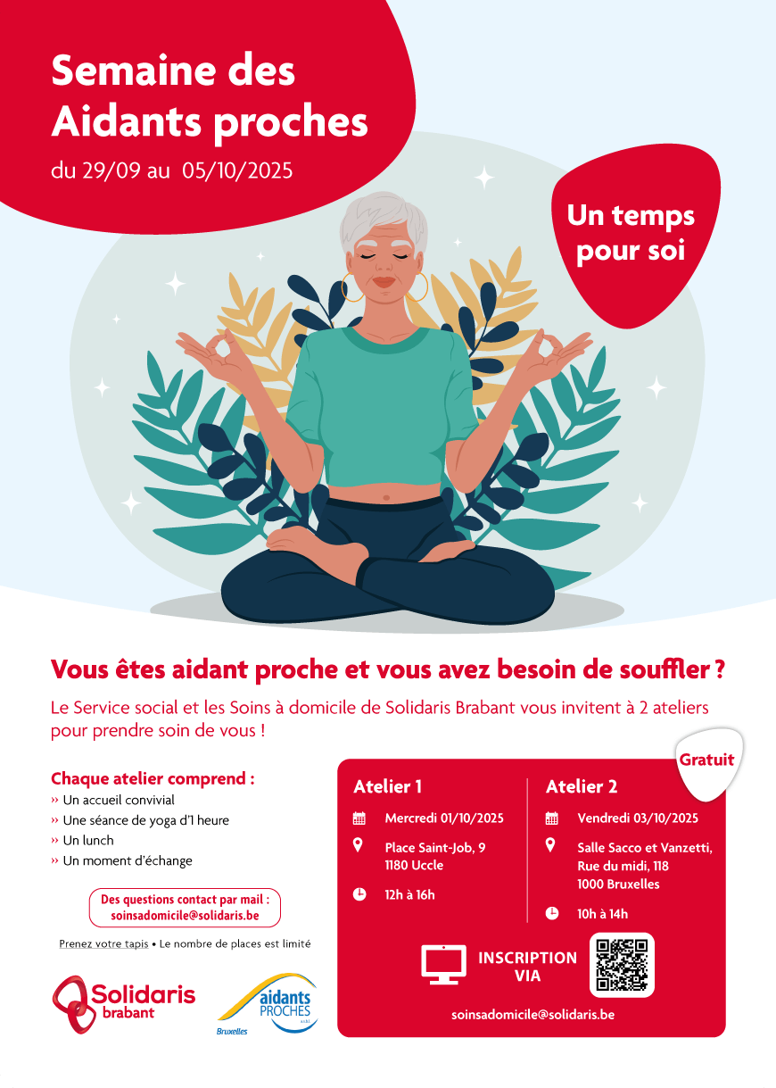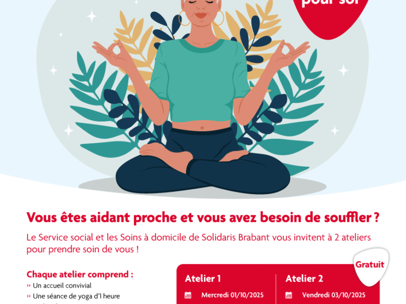 À l’occasion de la Semaine des Aidants-Proches, Solidaris Brabant vous invite à deux ateliers placés sous le signe du bien-être physique et mental. Ce moment vous permettra également de découvrir comment notre Service social et notre offre de soins et services à domicile peuvent vous aider concrètement dans ce rôle très prenant.